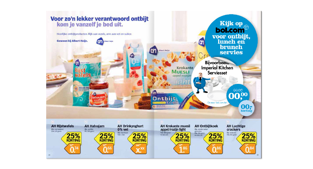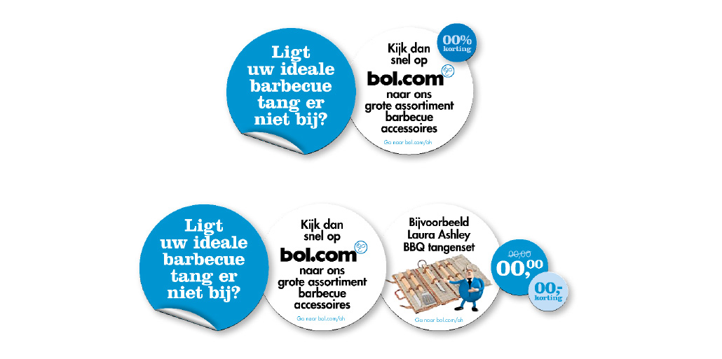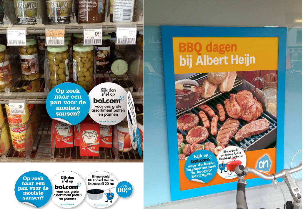 Vraag van klant: Hoe kunnen wij binnen de regels van AH onze identiteit (DNA) en daarmee herkenbaar communiceren op de winkelvloer. Dit uiteraard binnen de huidige communicatiestijl van bol.com. Concept: Stickerconcept. De sticker bevat de call-to-action en kan wordengekoppeld aan één of meerdere producten. De sticker is herkenbaar als bol.com en laat zich makkelijk blenden met de AH stijl.